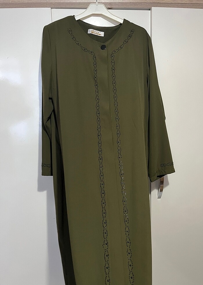 Hiç giyilmemiştir. Düğmelidir. Omuzdan itibaren boyu 122 Kol boyu 56 cm dir.