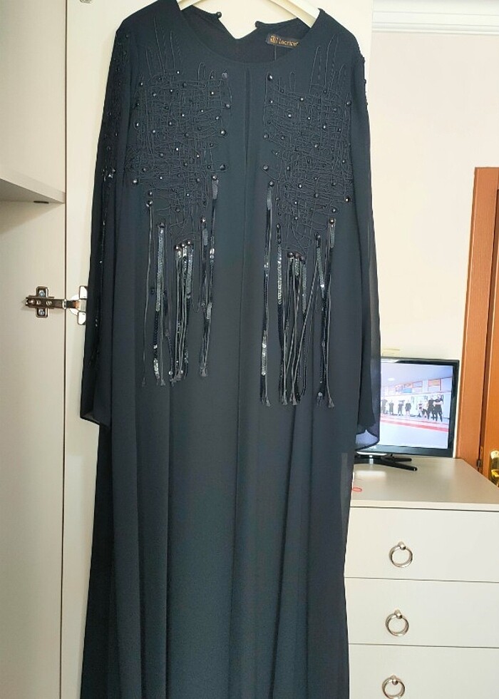 Düğün için alındı ama hiç giyilmesi etiketi üzerinde duruyor. LACİRMA marka ferace görünümlü elbise üzeri şifonlu 44 46 beden tercih edebilir