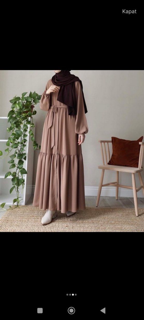 Bej renkte, belden kemerli, yüksek yakalı ve salaş kesimli uzun elbise ferace temiz sorunsuz lemaye tesettür de alındı marka