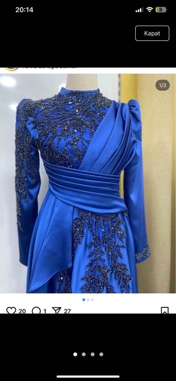 Uzun, yüksek yakalı ve uzun kollu mavi abiye şık işlemeli detaylara sahip. Drapeli ve regular fit kesimiyle düğünler için uygundur. ✨1 defa giyildi koruma poşetinde gönderilecek makul teklife açık