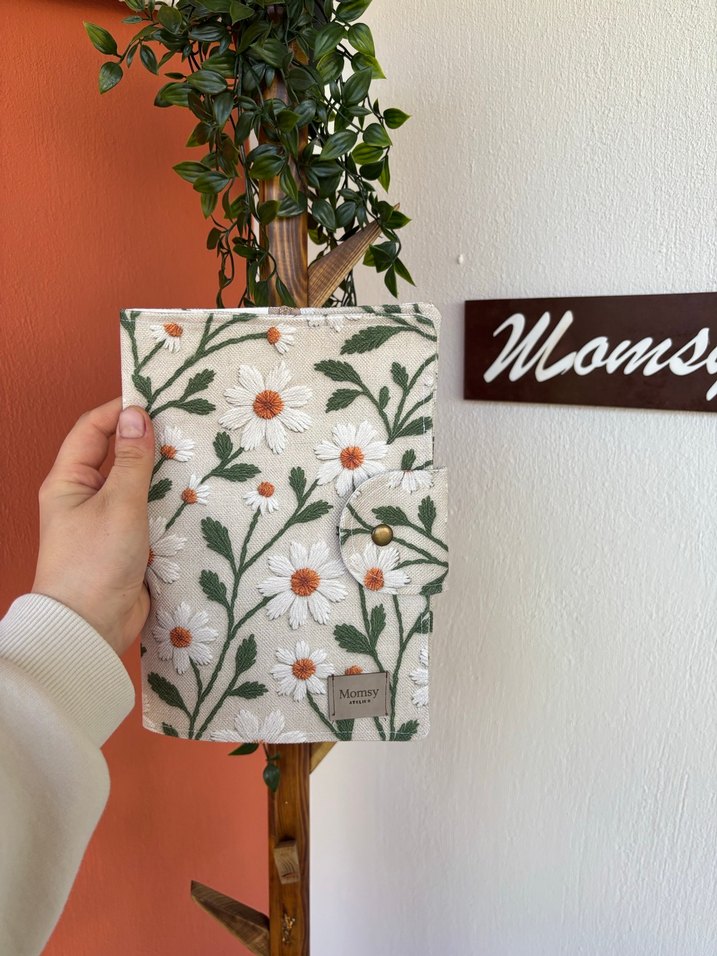 Fermuar Bölmeli Beyaz Papatya Desenli Kitap Kılıfı