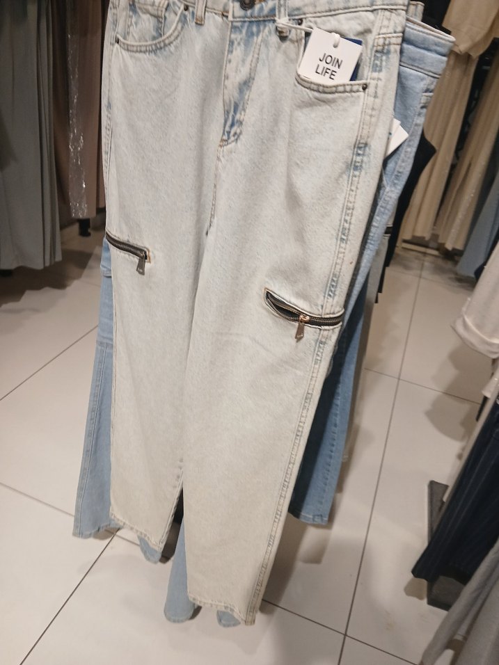 açık mavi renkli, fermuarlı ceplere sahip, midi boy ve bol kesim kadın jean pantolon. Rahat ve gündelik kullanıma uygun.