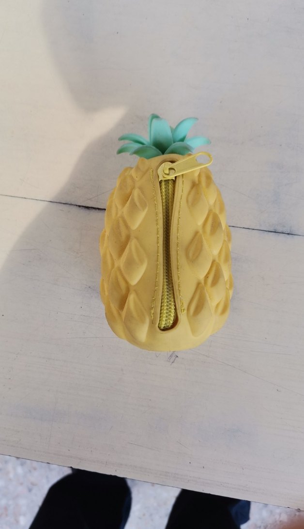 Pastel sarı renkte, bohem tarzda ananas desenli, fermuarlı çocuk cüzdanı.