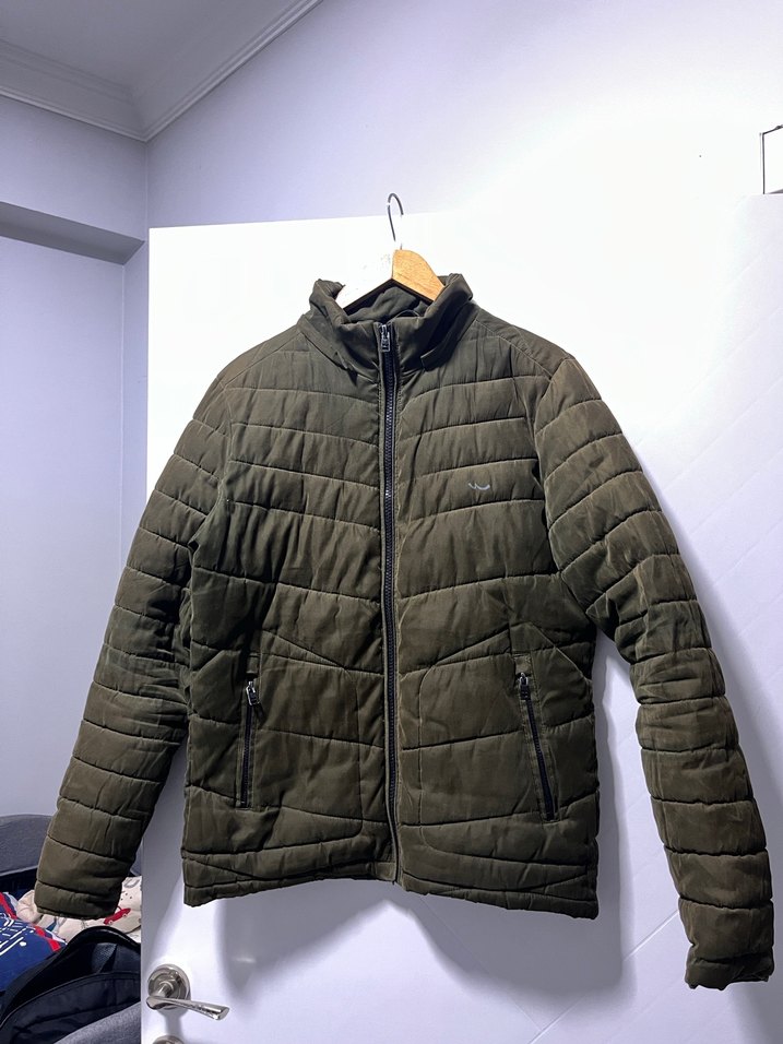 Fermuarlı, uzun kollu ve yumuşak kumaştan yapılmış asker yeşili erkek mont. Normal boyda, kesimi vücuda oturan ve günlük kullanıma uygun.