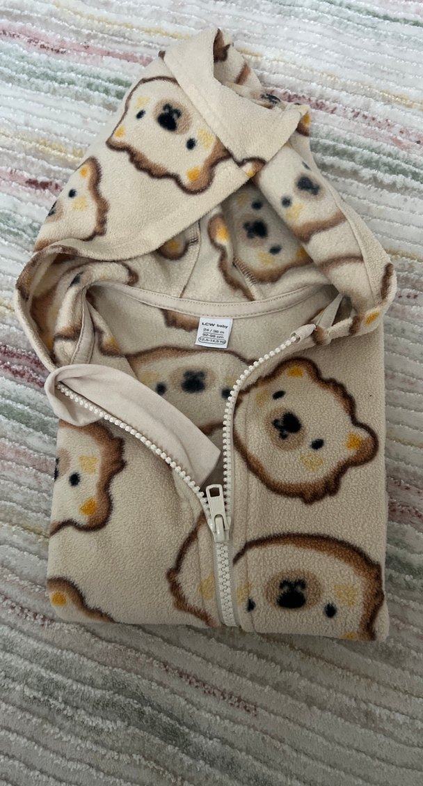 Fermuarlı, ayıcık desenli, yumuşak kumaştan yapılmış kahverengi ve gri tonlarında köpek sweatshirtü.
