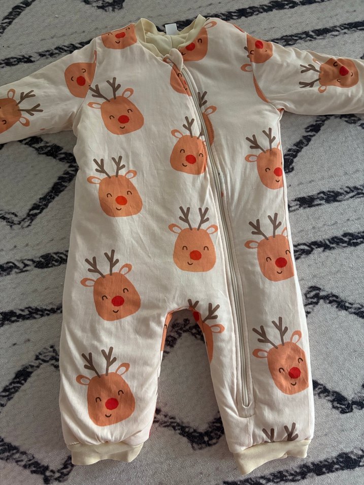 Yumuşak kumaştan yapılmış, baskılı geyik desenli beyaz bebek tulumu. Fermuarlı ve normcore tarzında bir modeldir. ❄️ Sıfır ayarındadır 1 defa giyildi