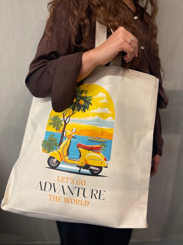 Fermuarlı, baskılı, kamel renkli kanvas kumaştan kadın omuz çantası. Sarı scooter ve sahil temalı desenle, sokak stili için uygun.