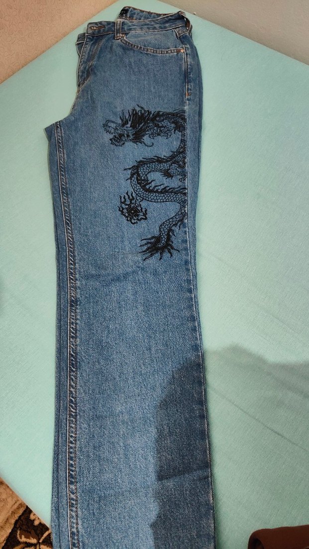 Fermuarlı detaylara ve baskılı ejderha desenine sahip, koyu mavi renkli, dar kesim kadın jean. Günlük kullanıma uygun.