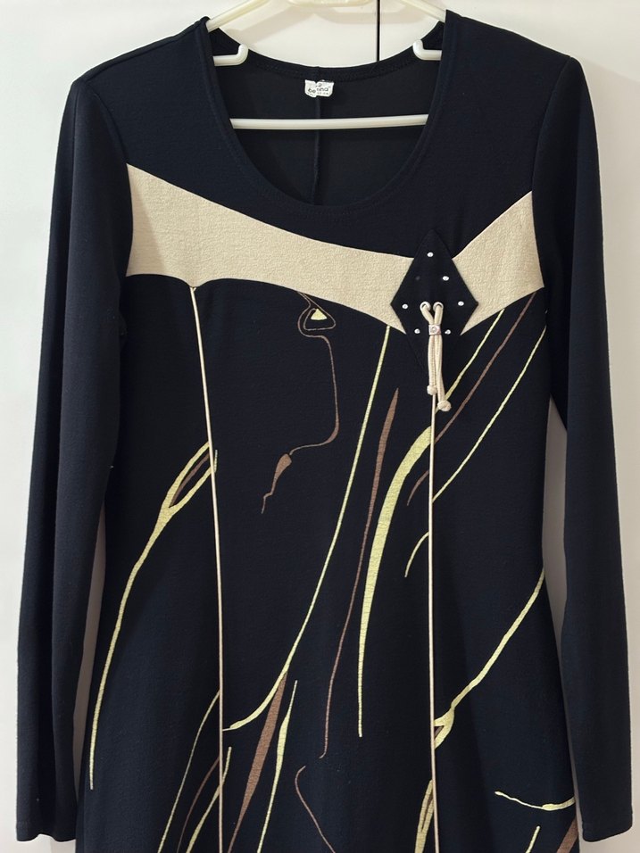 Dar kesim siyah tunik, yuvarlak yaka, uzun kollu ve uzun boyludur. Önünde soyut baskı ve fermuar detayına sahiptir. Sentetik kumaştan, çağdaş avant-garde tarzına uygundur.