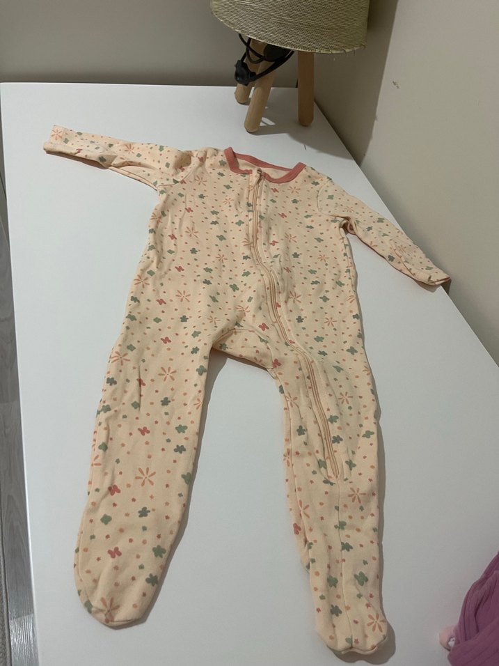 Pastel renkte, fermuarlı bebek kız tulumu. Beyaz zemin üzerine hafif çiçek desenleri bulunur. Yumuşak ve rahat kumaştan üretilmiştir.