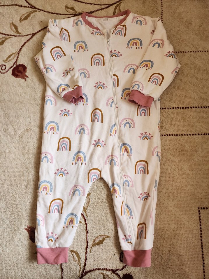Fermuarlı ön kısmı ve pastel renkli gökkuşağı desenleri olan yumuşak kumaştan yapılmış bebek kız tulumu. Pudra pembe ribana manşetlere sahiptir. hellobBaby 5 yaş