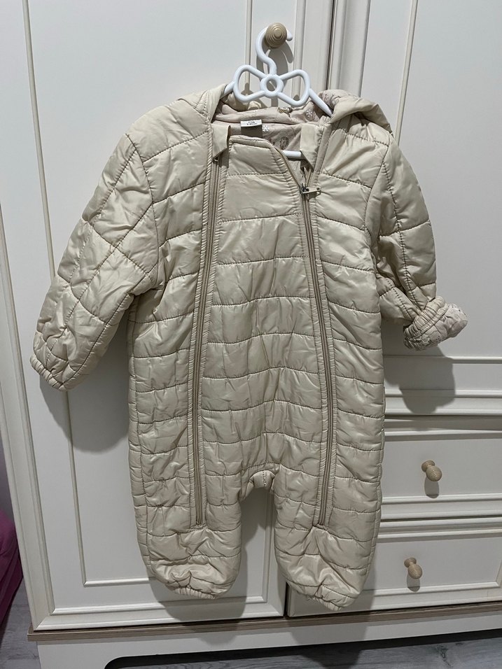 Krem renkte, fermuarlı ve yakalı bebek kız tulumu. Yumuşak, sıcak dokusu ve desensiz sade tasarımıyla dikkat çeker. ❄️