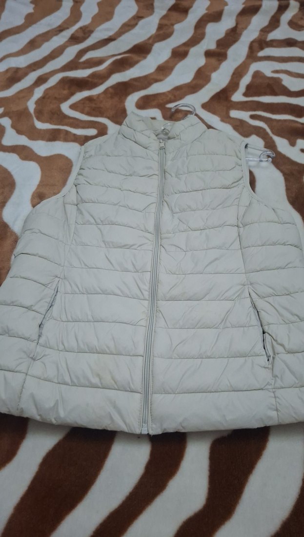 Yumuşak sentetik kumaştan, fermuarlı ve yüksek yakalı bej renkli kolsuz kadın yelek. Günlük sokak stiline uygun, vücuda oturan kesim.