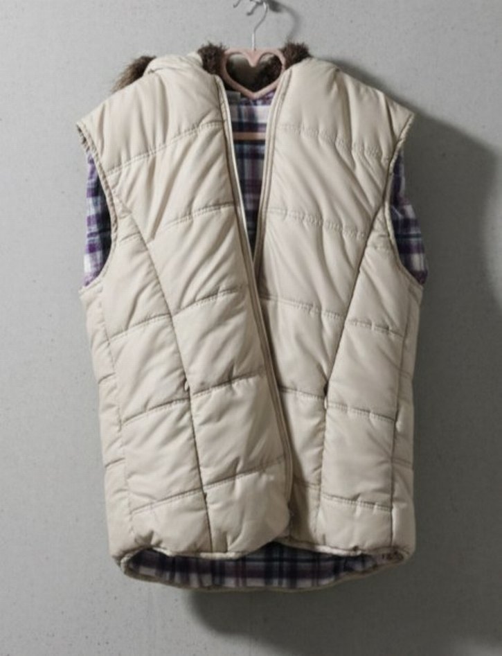 Düğmeli, yakalı ve kolsuz bej yelek. Yumuşak sentetik kumaştan, bol kesim ve normal midi boyda, rahat kullanıma uygundur.