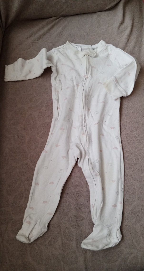 Fermuarlı ön kısmı ile kolay giyilen, pastel tonlarda yumuşak kumaştan beyaz bebek kız tulumu.