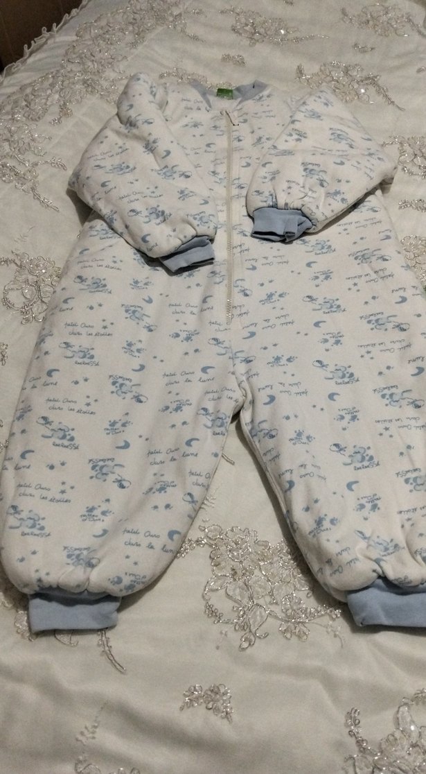 Yumuşak polar kumaştan yapılmış, fermuarlı beyaz bebek tulumu. Gri desenli ve rahat ribanalı manşetlere sahip. ❄️
