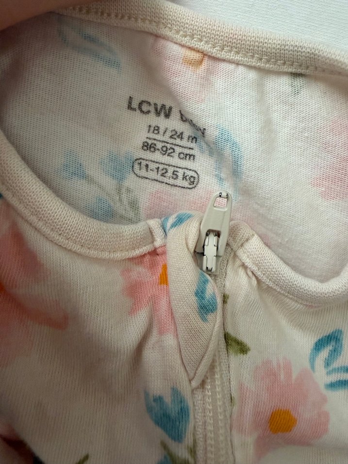 Fermuarlı, beyaz zemin üzerinde çiçek desenli, 18-24 ay ve 11-12,5 kg bebekler için tulum.