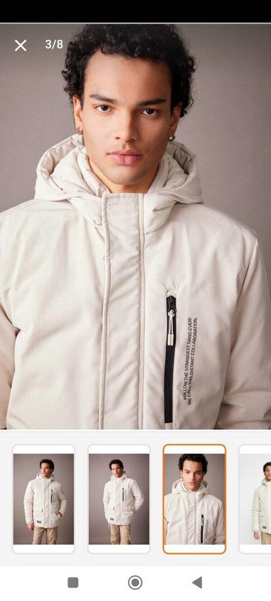 Fermuarlı, baskılı detaylara sahip beyaz, gri tonlarında erkek midi mont. Uzun kollu, dik yaka ve rahat kesimle günlük kullanım için uygundur. çok kaliteli sıcak tutar kumaşı su itici özellikli