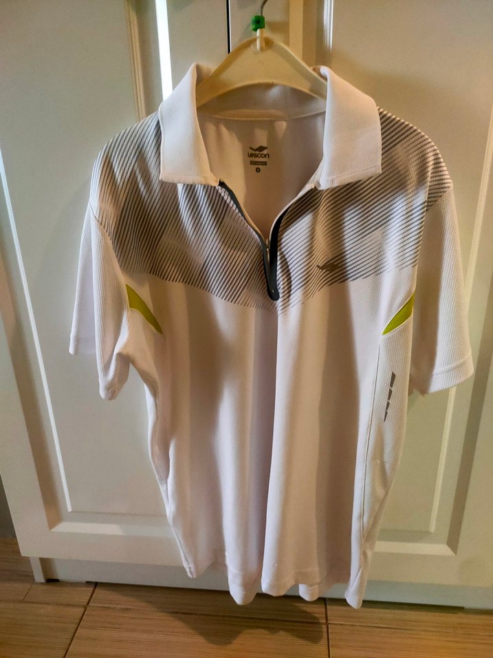 Fermuarlı önde, kısa kollu ve yakalı beyaz erkek polo tişört. Gri ve sarı detaylarla sportif ve günlük kullanıma uygun.