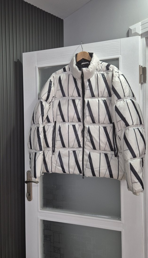 Fermuarlı, yüksek yakalı ve uzun kollu, beyaz zemin üzerine siyah çizgili, sentetik kumaştan yapılmış, sokak stiline uygun erkek montudur. Midi boy ve günlük kullanım için uygundur.