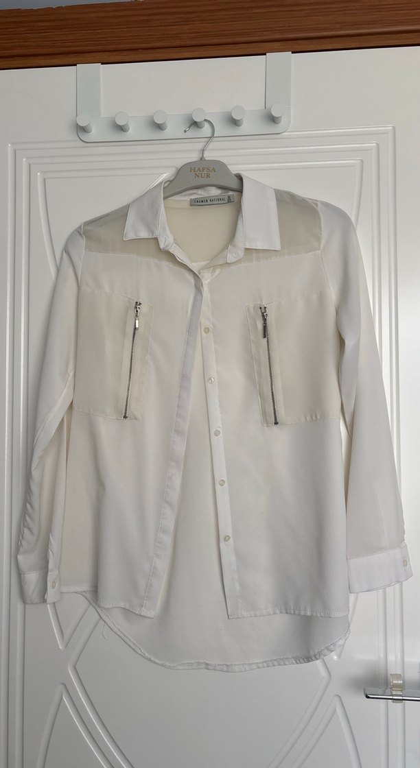 Beyaz kadın gömlek, uzun kollu, yakalı ve fermuarlı ceplidir. Rahat kesim ve midi boyda, yumuşak sentetik kumaştan üretilmiştir. Sokak stili ve ofise uygundur.İç gösterir çünkü ince gördüğünüz gibi.Hiç kullanılmadı sorunu defosu yok.S beden yaziyor fakat oversizedir bu yüzden M ve L ye de uyar.