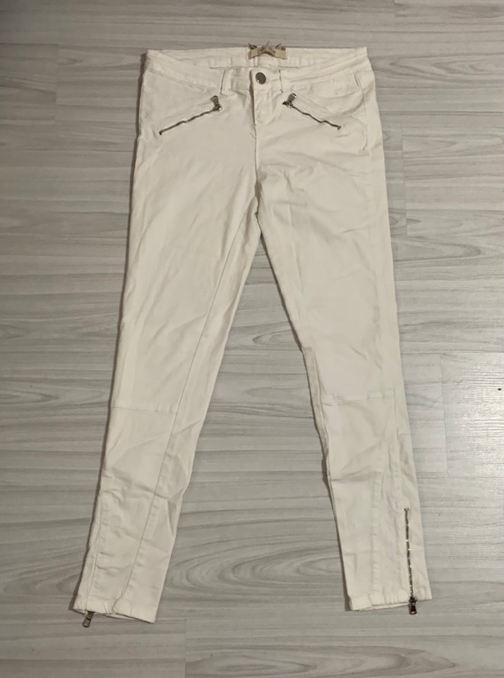 Fermuarlı cepleri ve bilekte fermuar detayları olan, sentetik kumaştan yapılmış beyaz, dar kesim midi kadın jean.