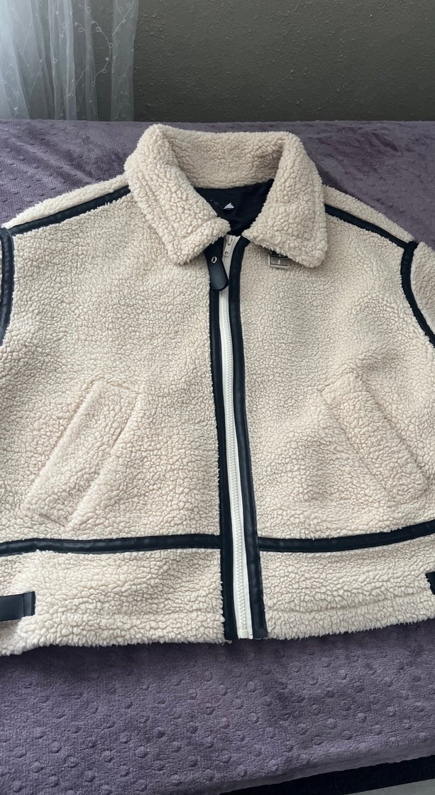 Yumuşak ve sıcak tüy detaylı, beyaz renkli, fermuarlı, uzun kollu ve normal boy kadın ceketi. Siyah şerit detaylarıyla rahat ve şık sokak stili sunar.