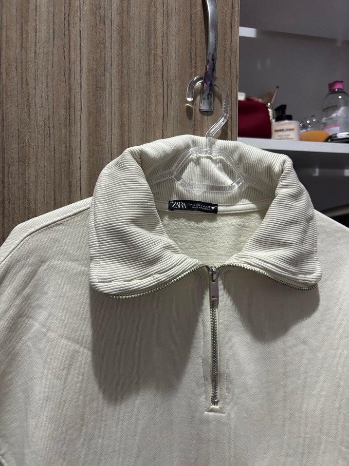 Yüksek yakalı, fermuarlı beyaz sweatshirt. Yumuşak ve sıcak kumaştan, bol kesim ve normal boyda, günlük rahat sokak stili için uygun. Minimalist ve desensiz tasarım.