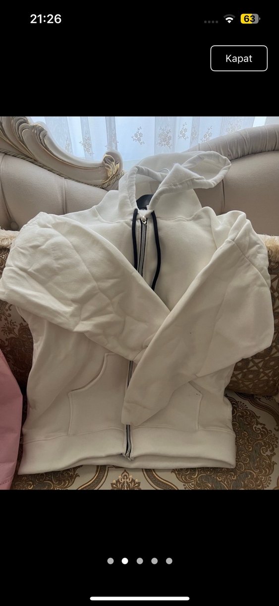 Beyaz renkte, cepli ,kapüşonlu ve fermuarlı kadın sweatshirtü. Uzun kollu, bol kesim ve yumuşak, sıcak kumaştan günlük kullanım için uygundur. Herhangi bir deformesi yoktur hiç kullanılmamış