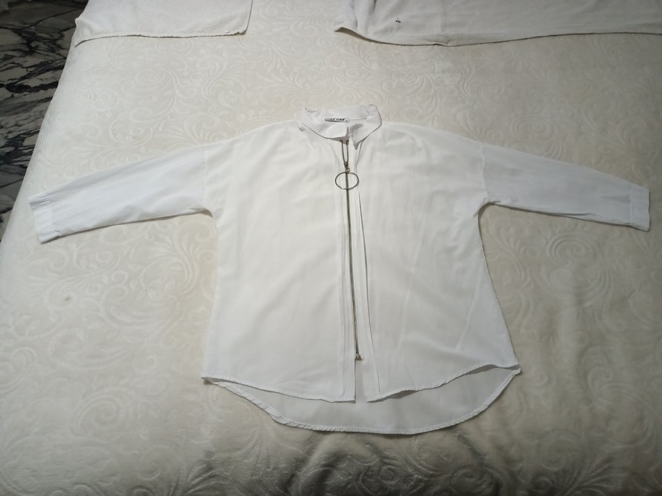 Bol kesim beyaz keten gömlek, yakalı ve uzun kollu. Önde halka çekmeli fermuar detayı bulunur, günlük kullanıma uygundur.