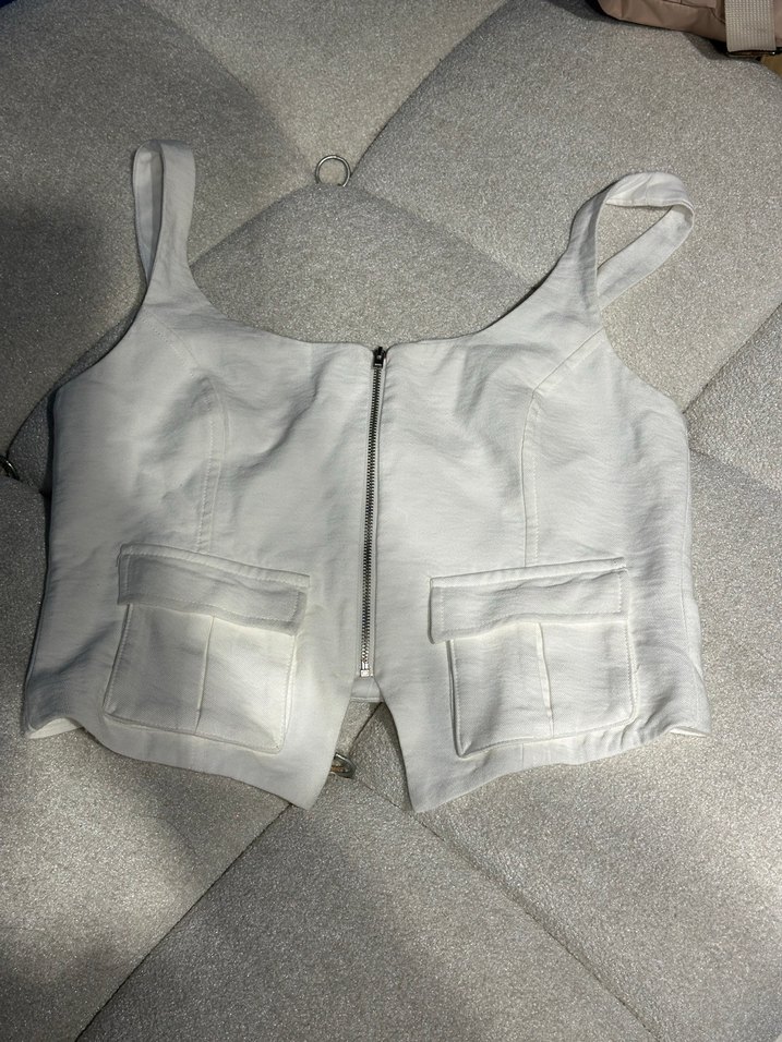 1 kere giyildi daha sonra kuru temizlemeye verildi Fermuarlı, kısa kesim beyaz keten, askılı ve cepli, günlük sokak stili için uygun mini büstiyer.