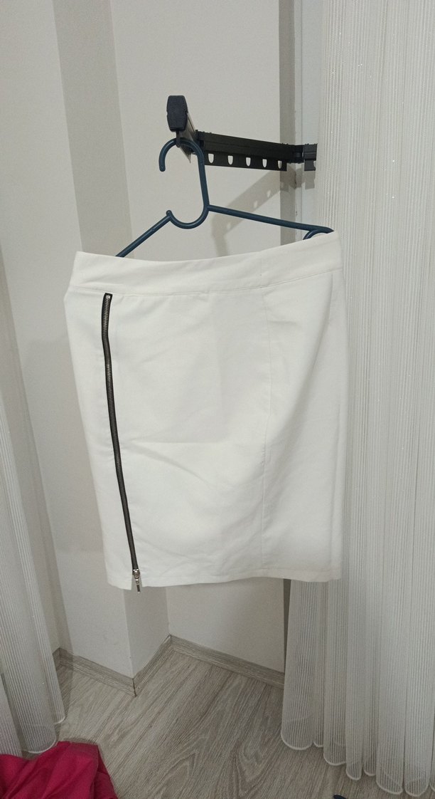 Fermuarlı detaylı, düz beyaz mini etek. Düzgün sentetik kumaştan, günlük sokak stiline uygun. ⚡