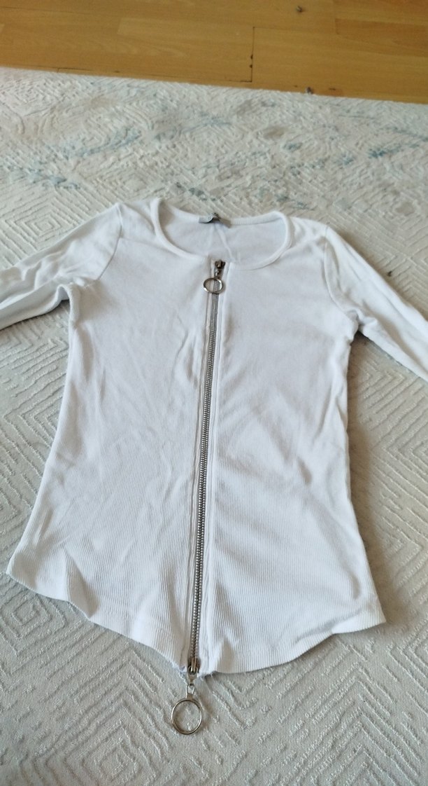 uzun kollu, ön fermuarlı beyaz pamuklu tişört. Yuvarlak yaka ve düz dokusu ile rahat sokak stili için uygundur.