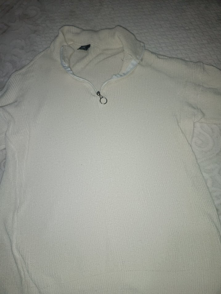 Beyaz, uzun kollu, fermuarlı ve yakalı, bol kesim, normal boyda, yumuşak ve sıcak kumaştan sweatshirt. Rahat ve dış mekan kullanımı için uygundur.