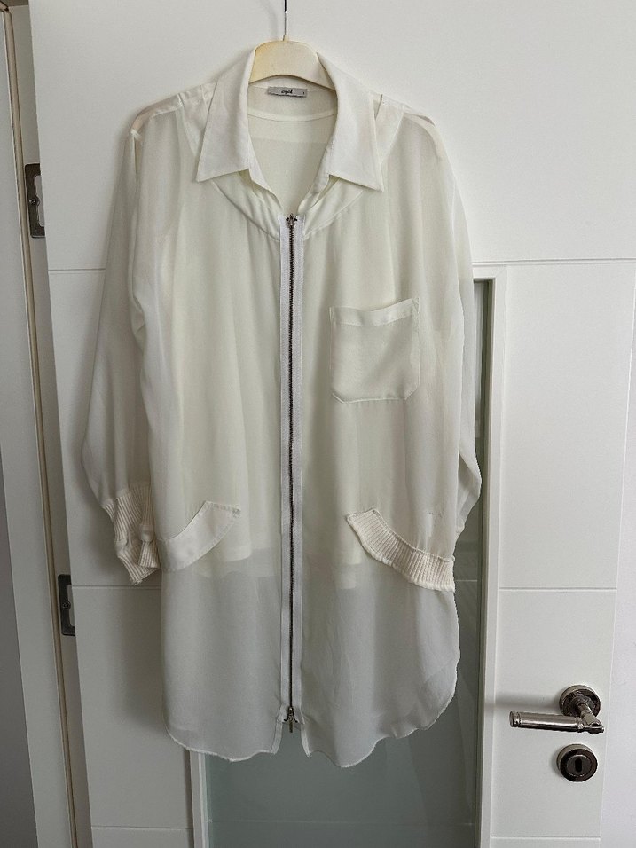 Beyaz uzun gömlek, fermuarlı ön, yakalı ve uzun kollu. Salaş kesim, sokak tarzı, günlük kullanım için uygun.