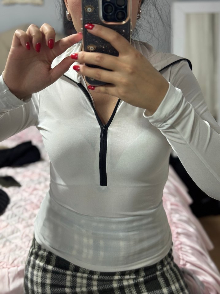 Fermuarlı ön kısmı ile beyaz, v yaka ve uzun kollu, ince kesim kadın bluz. Pürüzsüz sentetik kumaştan, günlük rahat kullanım için uygun.