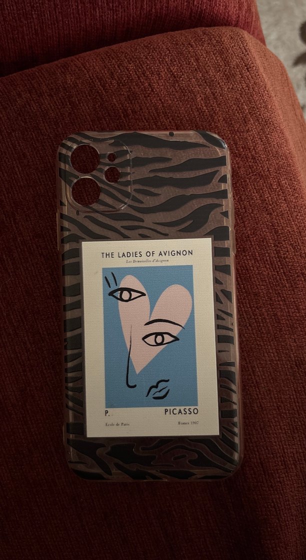 Koyu kahverengi, bohem tarzda fermuarlı telefon kılıfı. Picasso'nun 'The Ladies of Avignon' eseriyle süslenmiştir.