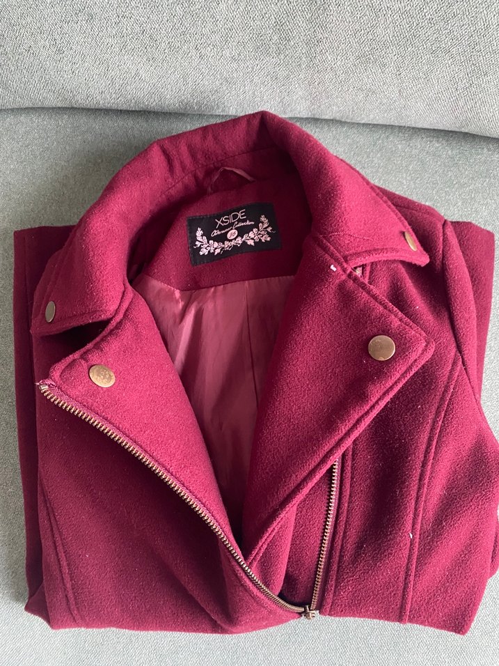 Fermuarlı ve metal çıtçıt düğmeli bordo kaban, iç kısmı yumuşak astarlı ve şık bir görünüm sunar.