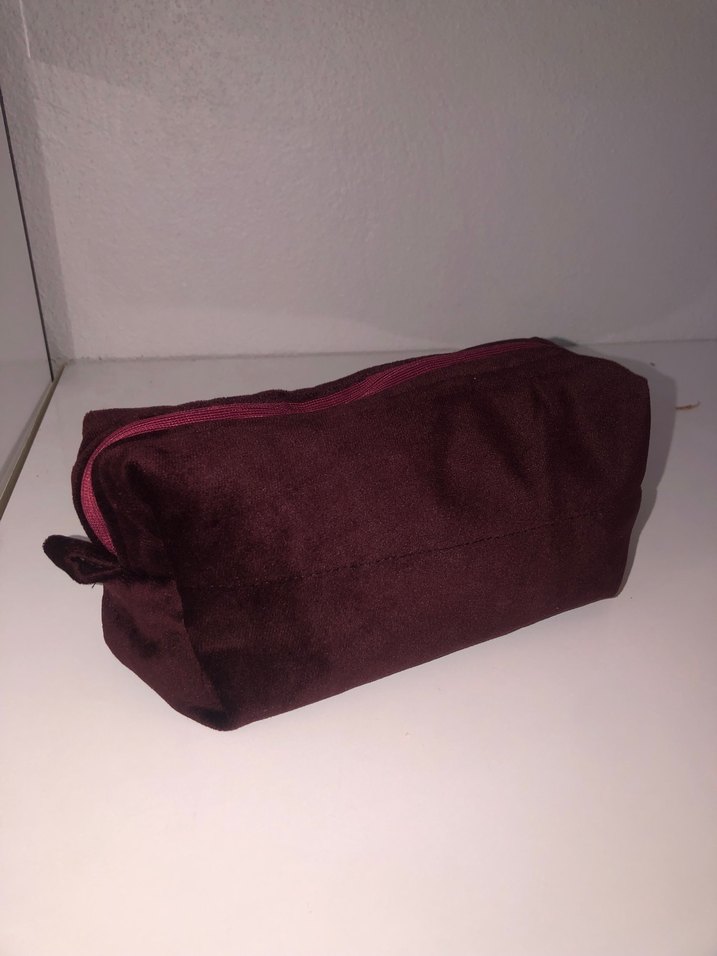 Fermuarlı kapama özelliğine sahip, yumuşak bordo süet malzemeden yapılmış kadın makyaj çantası