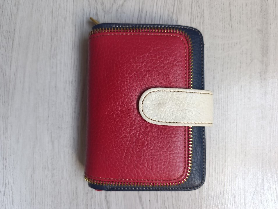 Kadınlar için fermuarlı, çok renkli deri cüzdan. Bohem tarzında, sade tasarımlı ve günlük kullanıma uygun sadece resim koyma bölmesinde bir lekesi var