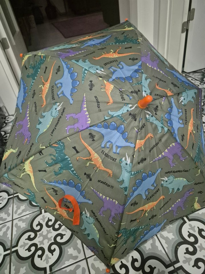Fermuarlı ve çok renkli dinozor desenli, gri tonlarında çoçuk şemsiyesi.