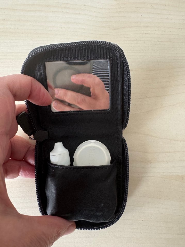 Fermuarlı siyah lens kabı, yerleşik ayna içerir. Counterculture tarzındadır.