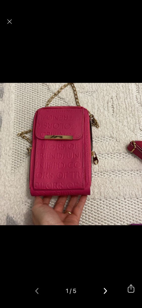 Fermuarlı bölmeleri, baskılı deseni ve altın zincir askısı olan koyu pembe deri çapraz çanta. Trend sokak stiline uygun.