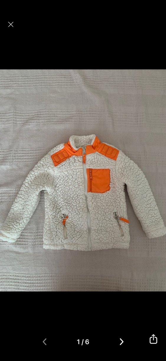 Fermuarlı cepleri ve yaka tasarımıyla, yumuşak ve sıcak kumaştan üretilmiş beyaz ve turuncu tonlarında, turuncu detaylı mont kaban