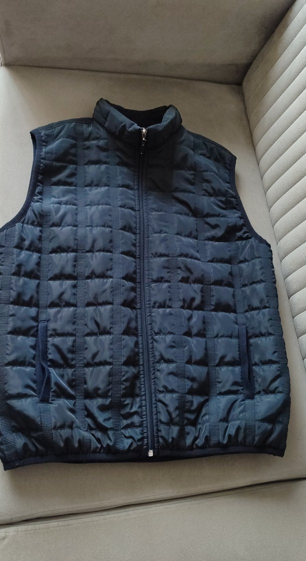 Fermuarlı, yüksek yakalı, kolsuz erkek yeleği. İnce kesim ve normal boyda, gündelik sokak stili için uygun. Mavi renkte ve kareli dikiş detaylı.