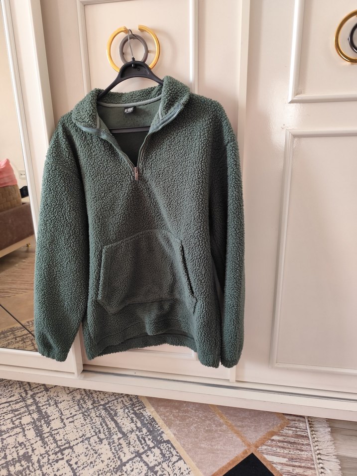 haki renk fermuarlı yüksek yakalı erkek polar sweatshirt, uzun kollu ve rahat kesimlidir. Günlük kullanım için yumuşak ve konforludur.
