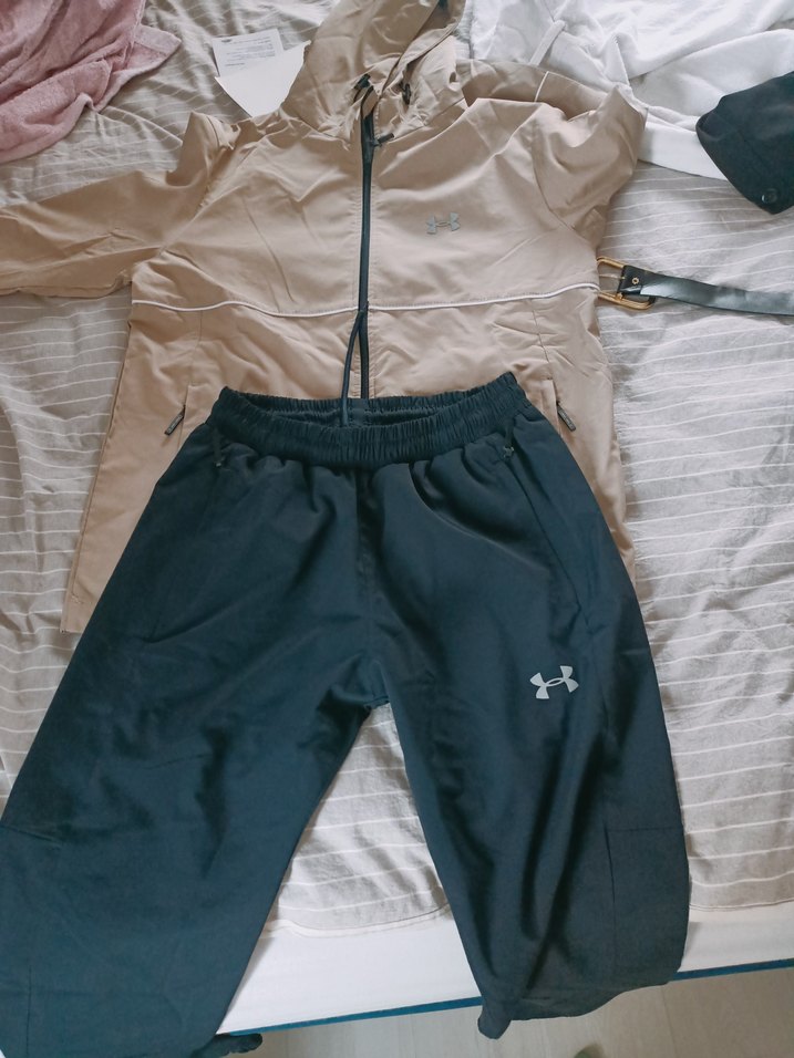 krem renkli, fermuarlı cepleri olan, yumuşak sentetik kumaştan yapılmış, spor ve sokak tarzı için uygun erkek eşofman takımı