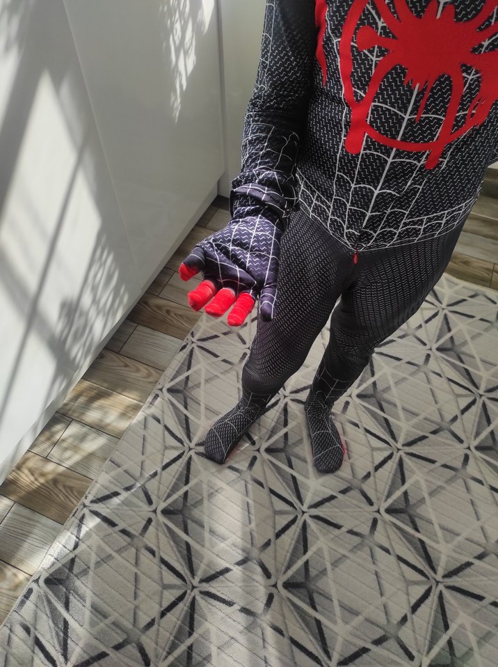 Fermuarlı, boğazlı ve askılı kollu gri çocuk streetwear tulumu. Koyu renkte, kırmızı örümcek desenli, sade tasarım.
