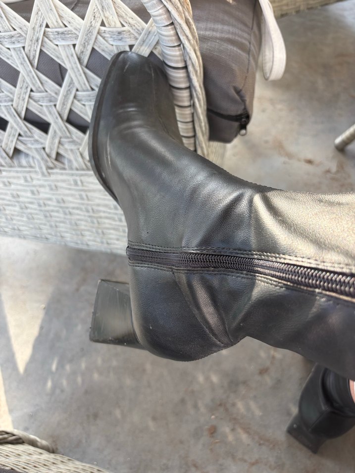 Gri renkte, stiletto topuklu, fermuarlı kauçuk dizüstü çizme. Biker tarzıyla sokak modasına uygun, günlük kullanıma elverişli.