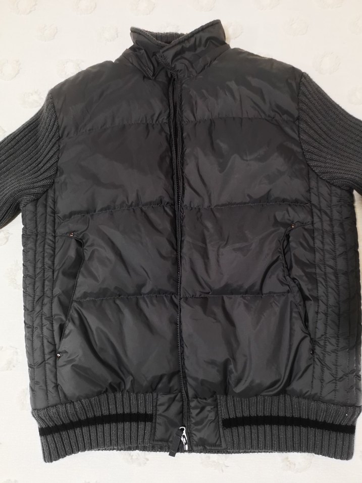 Fermuarlı, yüksek yakalı, uzun kollu, sentetik kumaştan yapılmış siyah erkek mont.dış mekan kullanımı için uygundur. Kolları ve arkası triko dur. Gayet kalın rahat kalıptır. Xxl uygundur. Esnektir. Ölçüsü çekildi.